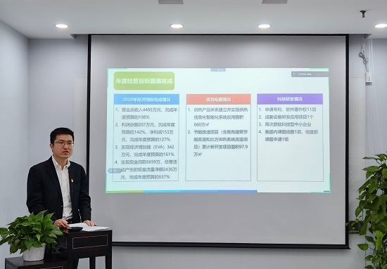 會(huì)上,李處林同志作了題為“務(wù)實(shí)創(chuàng)新 千方百計(jì)謀發(fā)展”的工作報(bào)告。報(bào)告指出,2020年公司積極應(yīng)對(duì)和克服疫情影響、經(jīng)濟(jì)下行等不利因素,認(rèn)真落實(shí)集團(tuán)公司及本部深化改革、提質(zhì)增效、對(duì)標(biāo)一流等行動(dòng),在提質(zhì)增效、市場(chǎng)開發(fā)、技術(shù)創(chuàng)新等方面下苦功,謀實(shí)效,規(guī)?;ㄖ苄Ц脑焯嵘龢I(yè)務(wù)取得了新的突破,以智能化、信息化、數(shù)字化核心產(chǎn)品為依托的智慧能源服務(wù)業(yè)務(wù)也實(shí)現(xiàn)了多點(diǎn)開花,公司發(fā)展進(jìn)入了新的階段,圓滿完成了年初制定的各項(xiàng)經(jīng)營(yíng)任務(wù)。 2021年是十四五開局之年,公司將全面貫徹落實(shí)集團(tuán)和建筑節(jié)能公司各項(xiàng)工作部署,繼續(xù)堅(jiān)定信心、埋頭苦干,出實(shí)招、用實(shí)勁、求實(shí)效,大力推動(dòng)唯綠公司市場(chǎng)開發(fā)、技術(shù)創(chuàng)新、深化改革、黨的建設(shè)和黨風(fēng)廉政等各項(xiàng)工作;深挖“智慧供熱”業(yè)務(wù)市場(chǎng),力爭(zhēng)項(xiàng)目落地,抓好現(xiàn)有項(xiàng)目推進(jìn),挖掘重點(diǎn)項(xiàng)目新需求;提高企業(yè)自主創(chuàng)新能力,提高技術(shù)人員自身專業(yè)能力;貫徹落實(shí)《全面深化三項(xiàng)制度改革三年行動(dòng)方案》,多途徑積極開展員工培訓(xùn),打造高績(jī)效團(tuán)隊(duì);對(duì)采購(gòu)工作做到計(jì)劃提前、流程完善,符合各項(xiàng)制度要求,提高采購(gòu)率和計(jì)劃準(zhǔn)確率;持續(xù)加強(qiáng)主題教育工作力度,深化“三基建設(shè)”,夯實(shí)工作平臺(tái),鞏固深化統(tǒng)戰(zhàn)群團(tuán)工作。